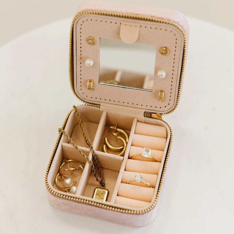 Your gorgeous accessories deserve an equally stunning jewelry case! This luxe velvet jewelry box is sure to lend an elevated feel to your travels or your dresser at home. The Eloise features three necklace hooks, a mirror, six earring holes, ring slots, and an adjustable, removable tabs section for extra organization options.