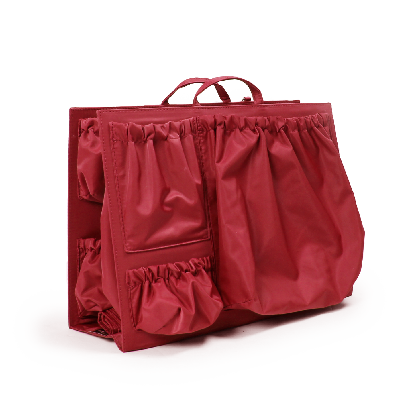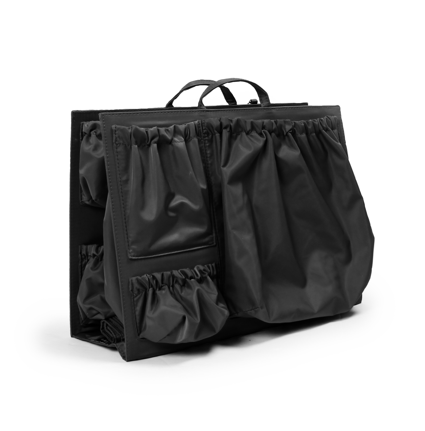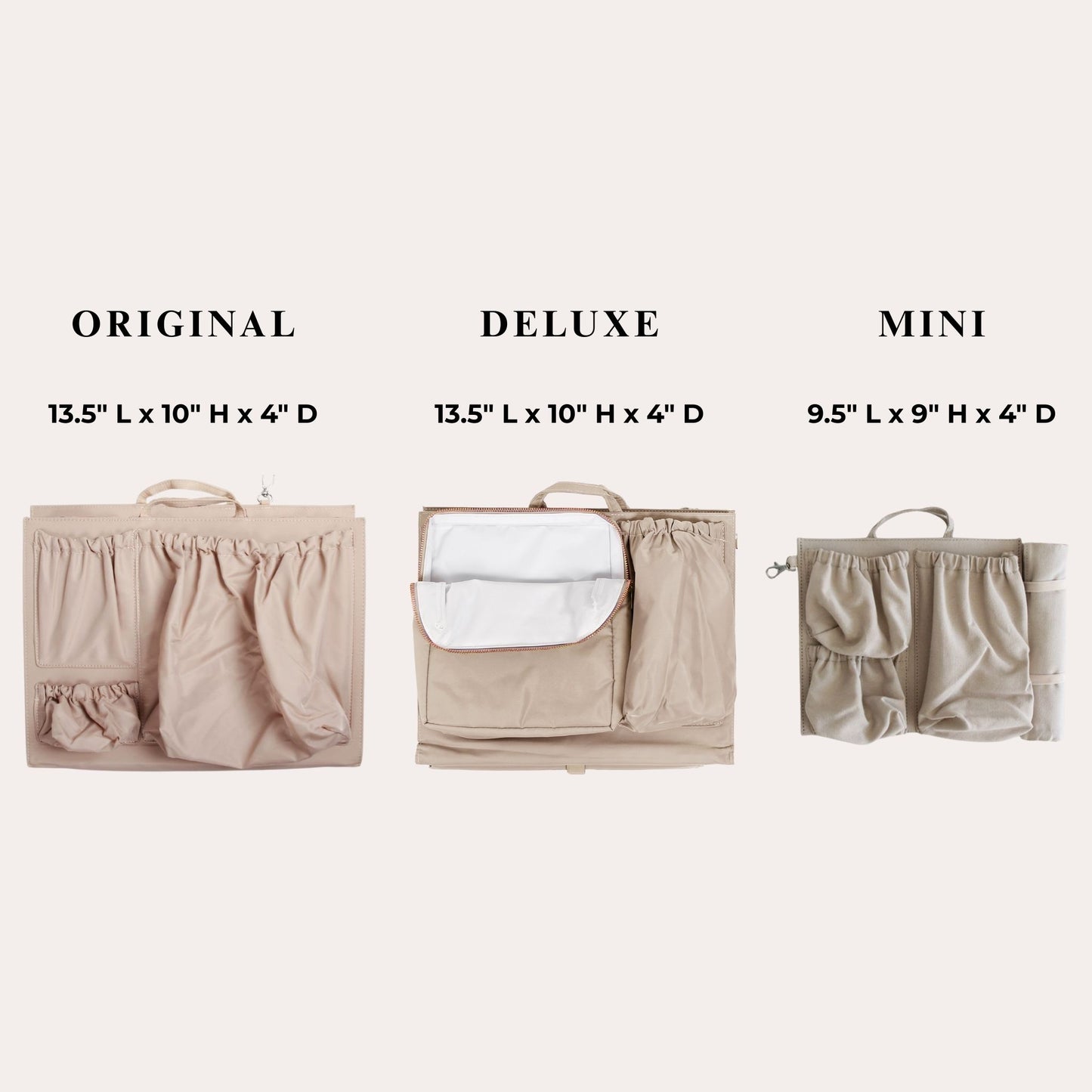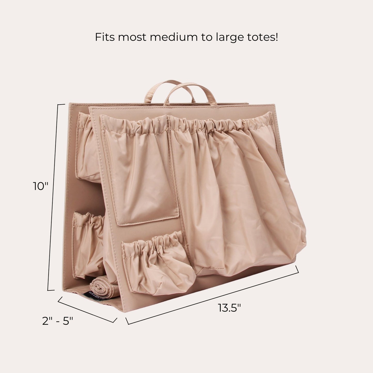 Removable organizer insert with 11 total pockets including an insulated pocket, key clasp, and washable changing mat. ToteSavvy original is best suited for large totes and oversized handbags. Made from wipeable nylon material, or cotton canvas (almond only). Canvas style has 10 total pockets instead of 11.