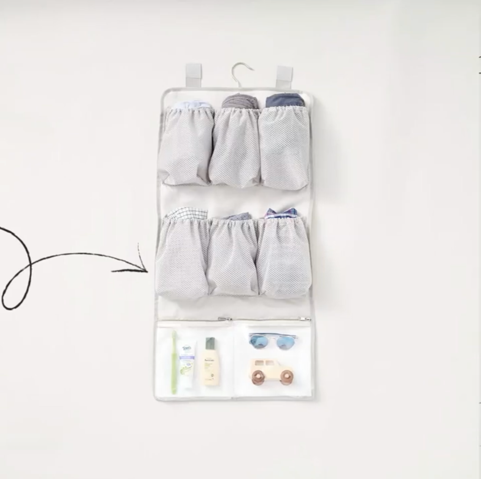 I love the idea of this travel piece for our infant. However, once you put clothes in the pockets, you can’t fold up the organizer for travel. I love the organization of it hanging open, but doesn’t work as travel item.
