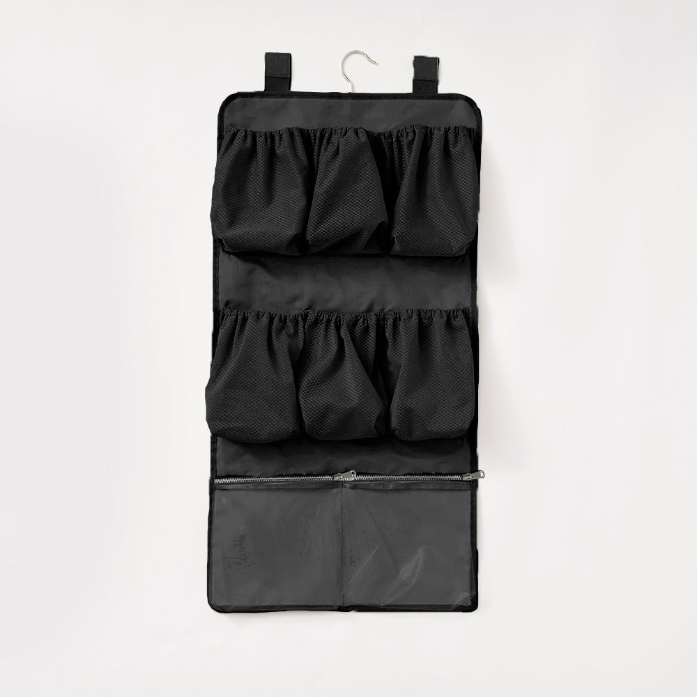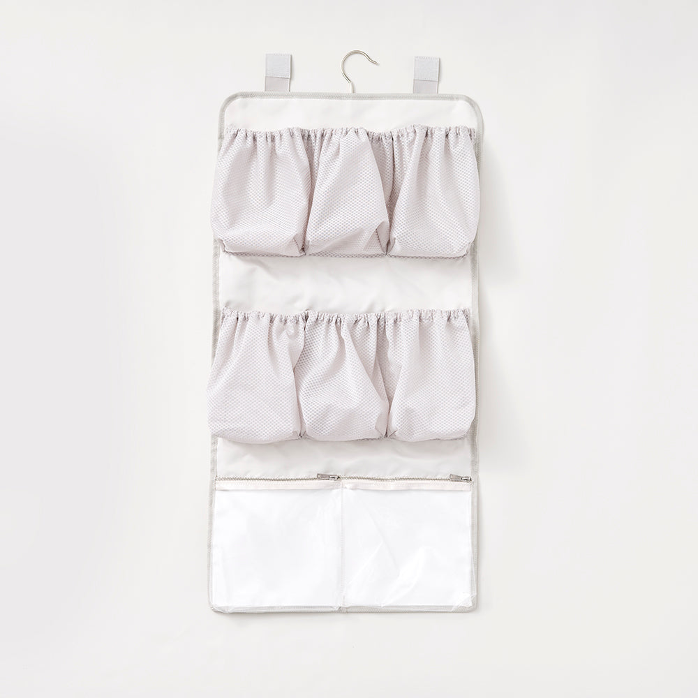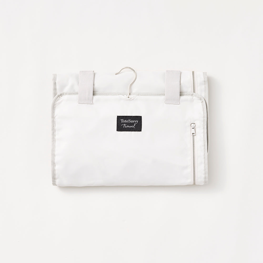 The organizer includes 6 mesh pockets, 2 clear zipper pockets, a large garment section on the reverse side, and a swivel hook to hang from a closet rod or door knob. ToteSavvy Travel folds in half and is secured with two Velcro tabs for compact storage. The garment section fits a child size hanger. Organizer sized for newborn - 5T clothing.