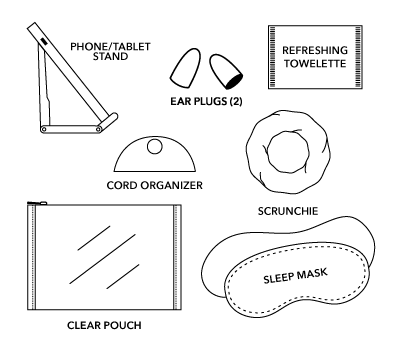 Rediscover the joy of travel with the new 7-piece Travel Set by Pinch Provisions. The clear zipper pouch contains a convenient assortment of practical luxuries: sherpa sleep mask (with silky backing), ear plugs, refreshing towelette, vegan leather cord organizer, and a phone/tablet stand.