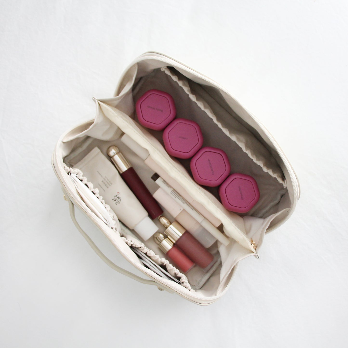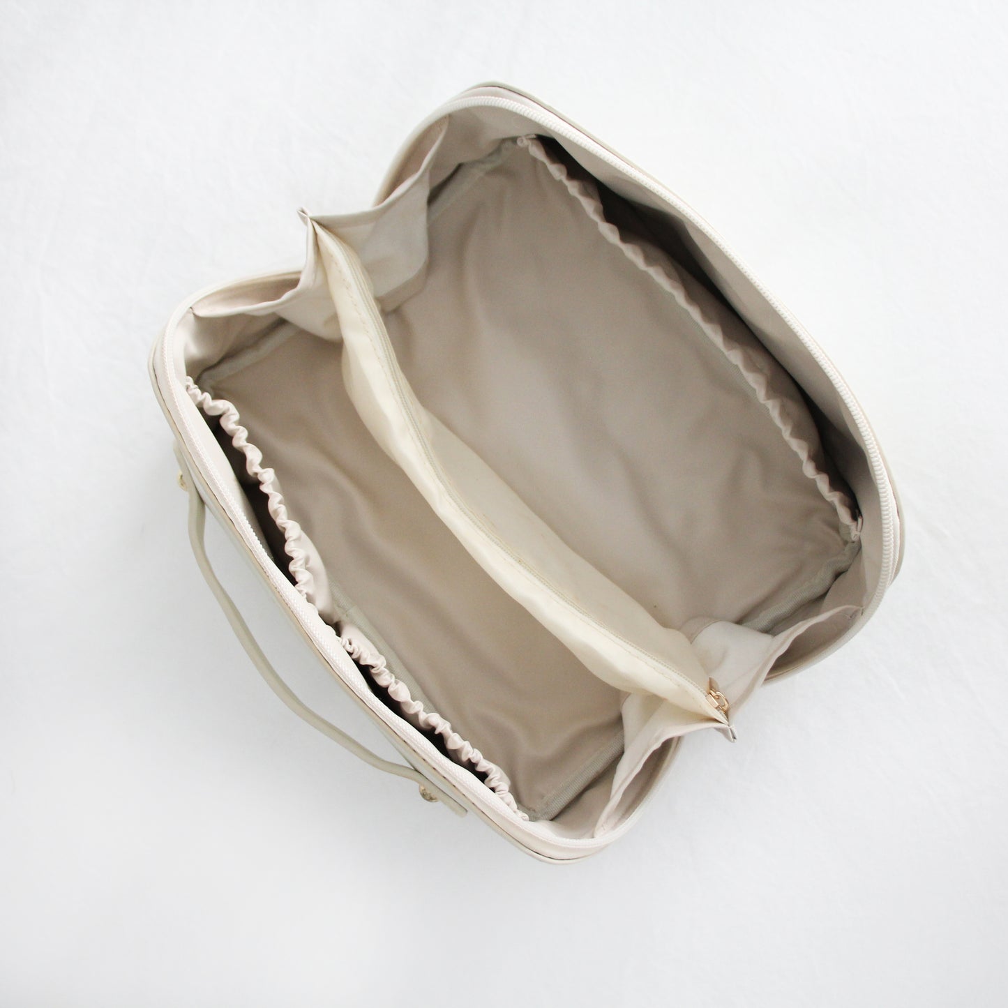Large capacity travel makeup and toiletry bag, perfect for your next trip. Crafted from gorgeous vegan leather inside and out, making it water-resistant and wipeable. Equipped with 4 inner pockets including a nylon fabric center divider with zipper pocket for small items. Gold hardware.