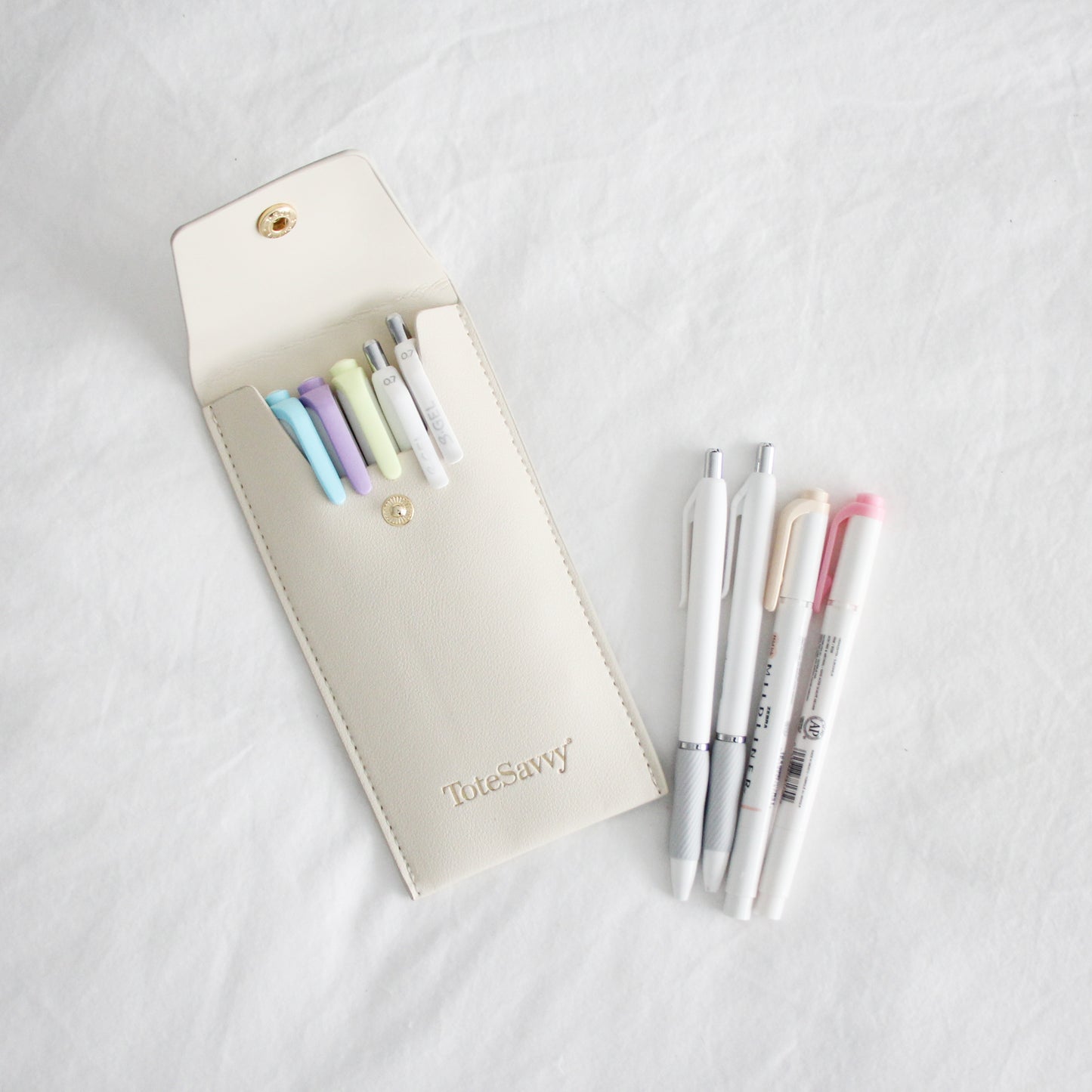 Our vegan leather flat pouch is perfect for organizing your little items. From pens, to makeup, to glasses, this multi-use pouch does it all. Made from wipeable vegan leather and adorned with gold hardware.